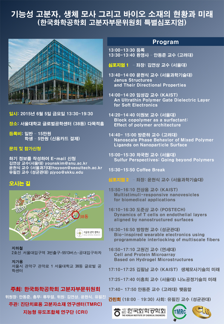 | 제목 | 기능성 고분자, 생체 모사 그리고 바이오 소재의 현황과 미래 심포지엄 | ||||